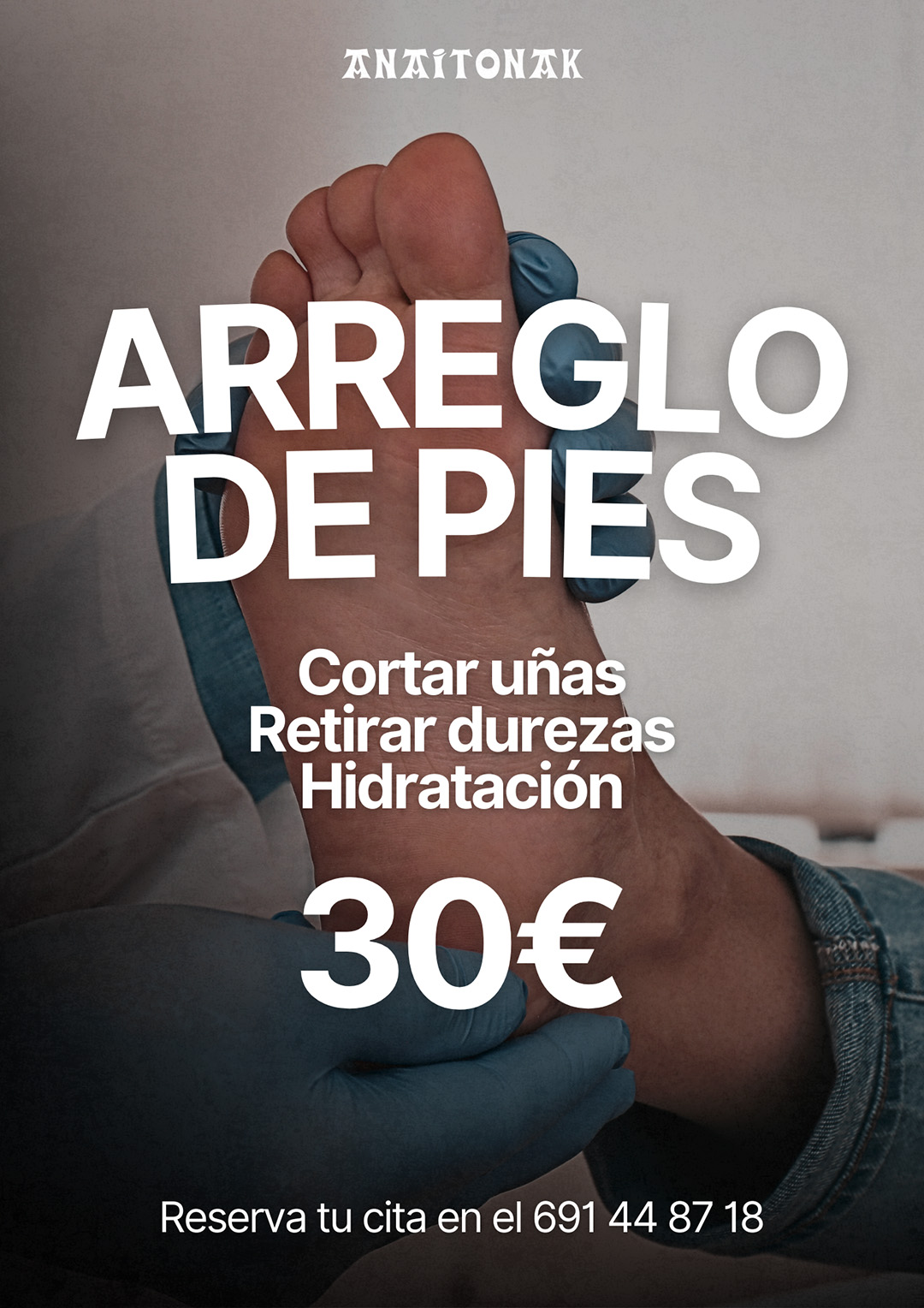 - Duela aste batzuk Anaitonakeko bileran eskatu zen moduan, Anaitasuna Estetikako zerbitzuak 65 urte baino gehiagokoentzako oinen txukuntzea eskainiko du, azazkalak moztea, gogortasunak kentzea eta hidratazioa barne, 30€-ren truke oinak osasuntsu mantentzeko. Informazio gehiagorako edo hitzordua eskatzeko 691 448 718 zenbakira dei dezakezu.