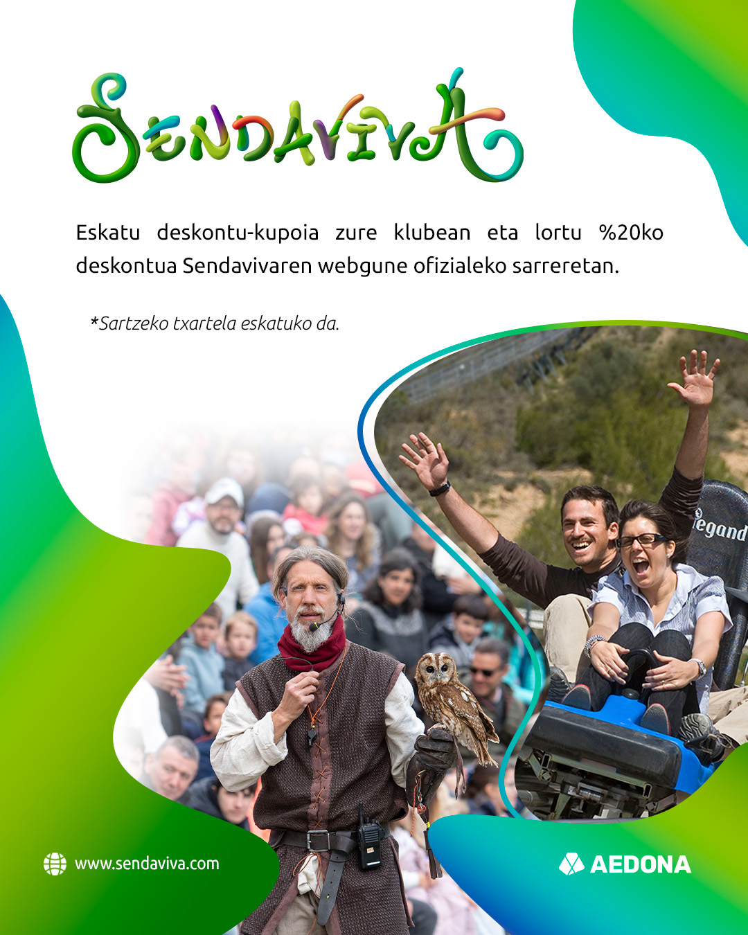 - S.C.D.R. Anaitasunako bazkide izateagatik Sendavivarako sarreretan %20-ko beherapena izango duzu. Erakutsi zure bazkide-txartela klubeko harrera-lekuan eta eskuratu zure kupoia.