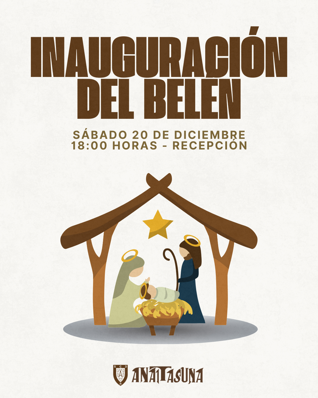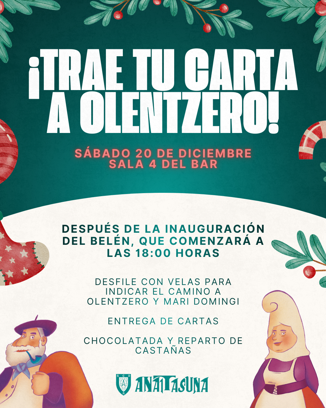 - El próximo sábado 20 de diciembre, a partir de las 18:00 horas, inauguraremos el belén de Anaitasuna. Después recibiremos la visita de Olentzero y Mari Domingi, que recibirán las cartas de todos los socios que acudan a la sala 4 del bar. Además, habrá chocolatada y reparto de castañas. ¡No te lo pierdas!