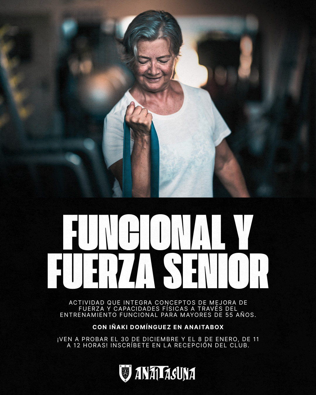 - ¡Funcional y fuerza senior, la nueva actividad de Anaitasuna para mayores de 55 años! Ya puedes probar esta nueva actividad, que integra conceptos de mejora de fuerza y capacidades físicas a través del entrenamiento funcional. Inscríbete a las pruebas en la recepción del club, que se realizarán el 30 de diciembre y el 8 de enero de 11:00 a 12:00 horas. Las sesiones serán impartidas por Iñaki Domínguez en Anaitabox.