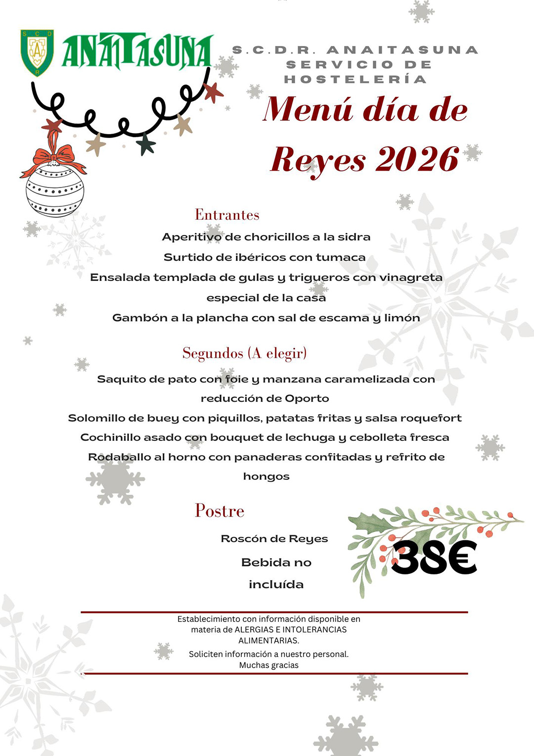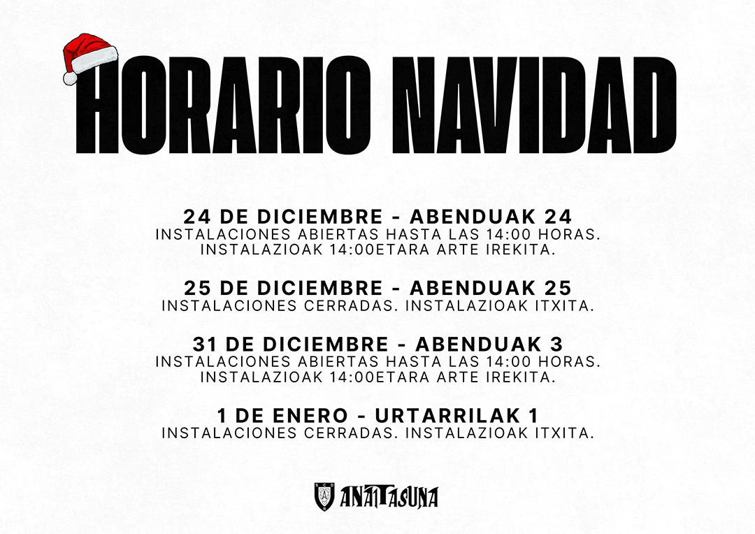 - Recuerda que el miércoles 31 de diciembre, las instalaciones estarán abiertas hasta las 14:00 horas y el jueves 1 de enero, el club permanecerá cerrado.