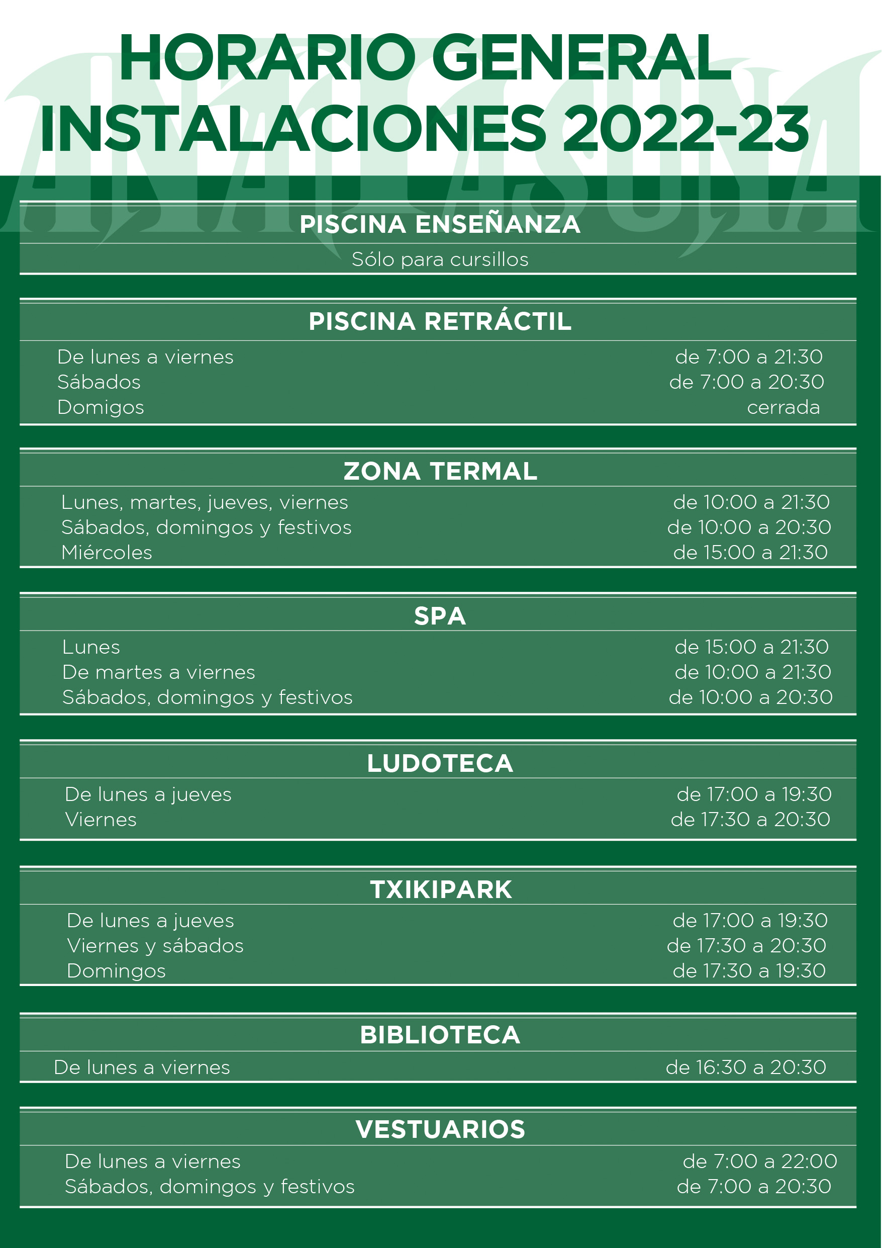 Salvo en las saunas (masculina y femenina), el resto de servicios es mixto y en ellos es obligatorio el uso de bañador.