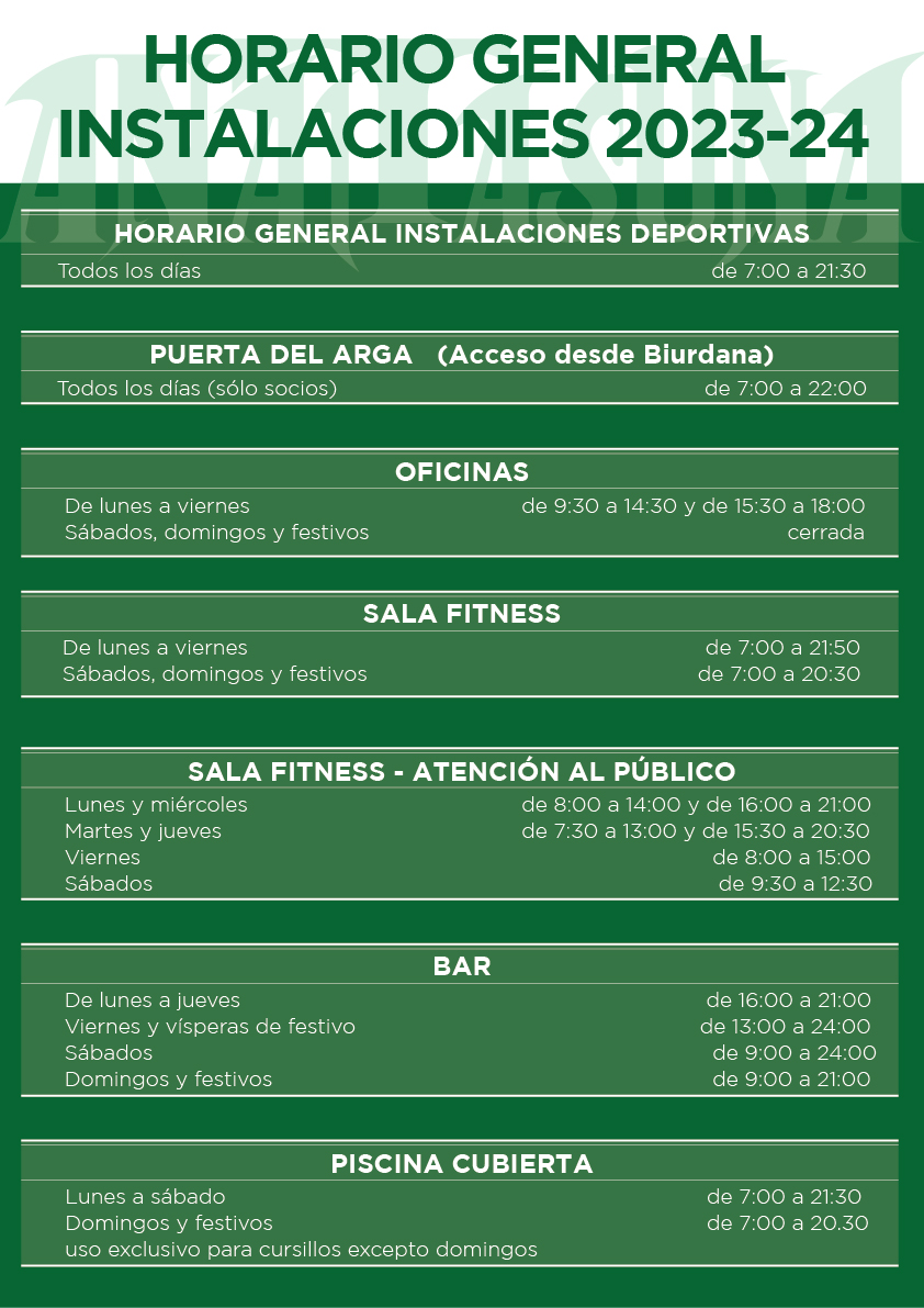 • Los acompañantes de los menores de ocho años podrán acceder gratuitamente al club junto a los menores media hora antes de la hora del entrenamiento o el cursillo, y deberán salir, como máximo, media hora más tarde de la finalización. Previamente, deberán solicitar autorización a través de un correo electrónico a recepcion@anaitasuna.com.