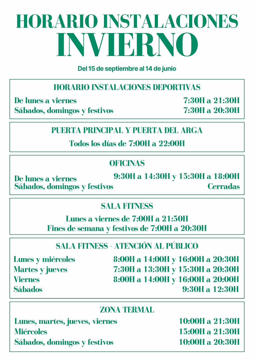 El hecho de abonarse a la Sala Fitness conlleva la afirmación de estar en plenitud de facultades físico/psíquicas para la práctica del ejercicio físico. Cualquier anomalía en este sentido debe ser transmitida al equipo técnico y adjuntar un justificante médico.